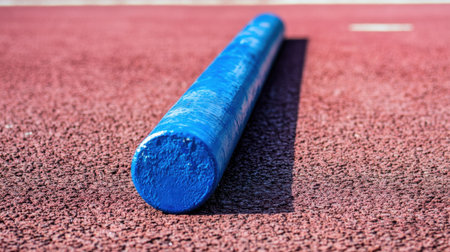 Close-up view of a bright blue relay baton resting on a textured track surface, symbolizing preparation and competition for an upcoming athletic event or race.