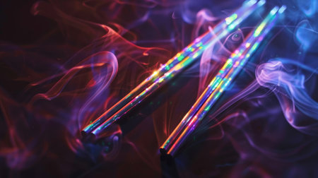 Neon chopsticks with vibrant light reflections among colorful smoke trails