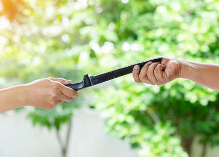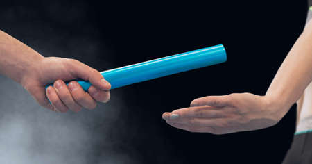 hands passing a relay baton on rowing team background and color tone effect.