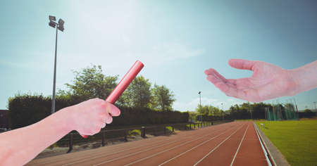 Composition of male runner passing baton to his teammate. sport and competition concept digitally generated image.