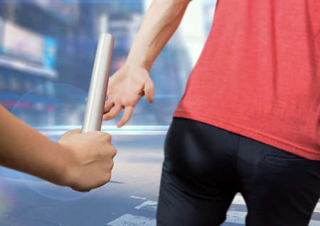 Composite image of hand passing a baton to male athlete against street in background. sports and fitness concept