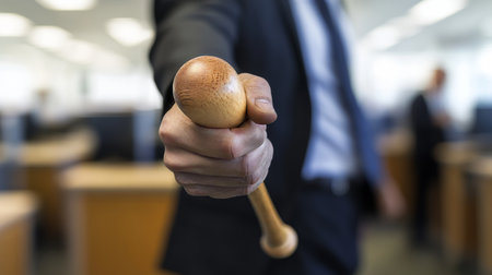 Close-up of man holding wooden bat in office setting, blurred background, potential for violence.