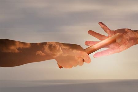 Athlete passing a baton to the partner against cloudy sky