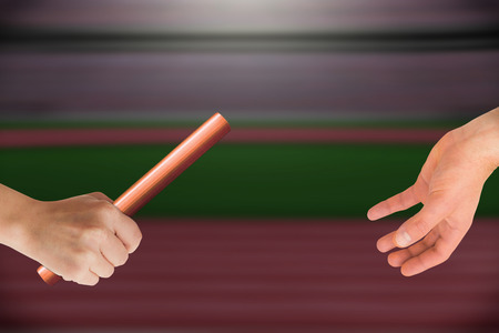Athlete passing a baton to the partner against view of a stadium