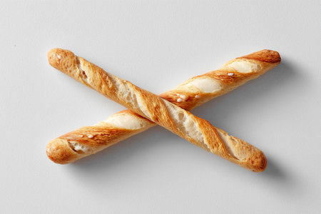Slender white bread stick crossed on smooth light background. Simple and elegant presentation emphasizing bread's texture. Concept of bakery, culinary arts, food photography.