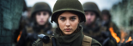 A determined female soldier stands in uniform alongside fellow service members, showcasing strength and focus in a military training environment.
