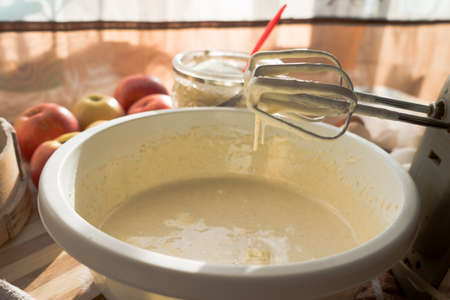 Prepared beaten eggs with a mixer, for making delicious and airy apple biscuit.