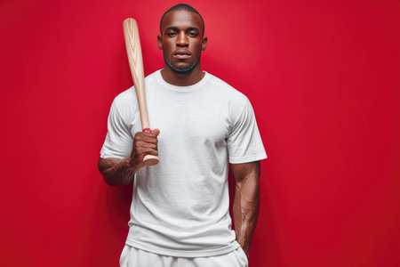 Muscular Athlete Holding Baseball Bat Against Red Background