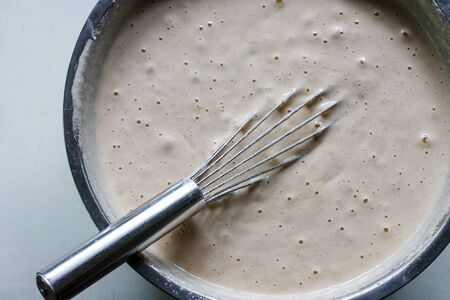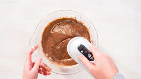Chocolate cake batter in a mixing glass bowl ready for baking bundt cake.