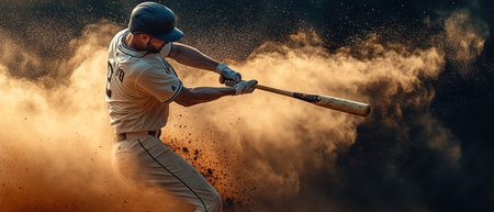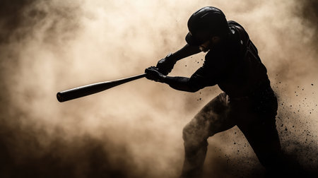 baseball player swings bat in dramatic, smoky atmosphere, capturing intensity of game. silhouette emphasizes strength and focus.