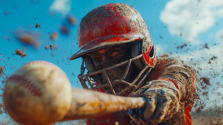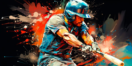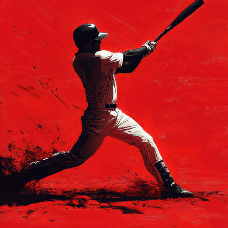 A batter captures the essence of baseball with a powerful swing, surrounded by bold red and black tones. Shadows accentuate the motion, evoking intensity and energy during the game.