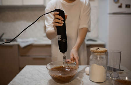 The girl prepares the cake, the pie, the ingredients are on the kitchen table. Selectiv focus. A girl beats dough for a chocolate cake with a mixer.