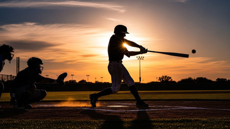 A baseball batter silhouetted against a vibrant sunset swings the bat, with a catcher in the background.