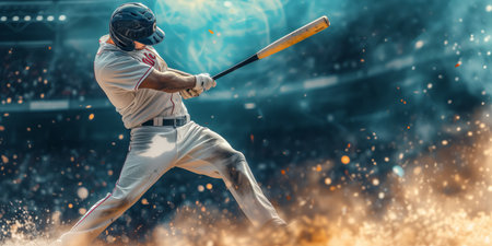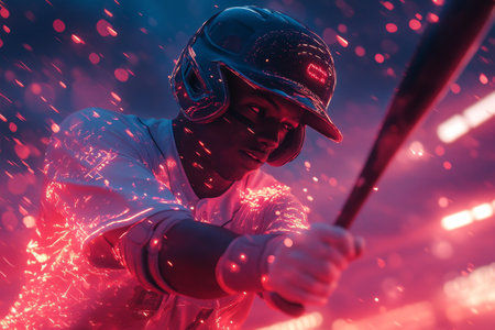 Baseball player batting, night game, stadium lights, fiery effect, sports action