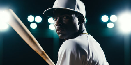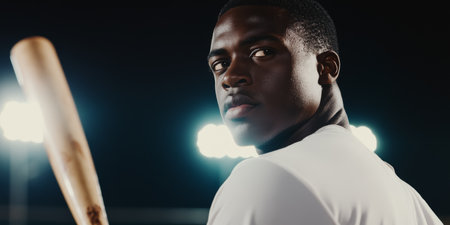 Confident Baseball Player Holding Bat Under Stadium Lights.