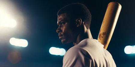 Focused Baseball Player Under Stadium Lights with Bat on Shoulder.