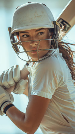 Portrait of beautiful young woman in white clothes and helmet, cricket player in man with bat, showing focus and motivation to win