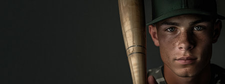 Portrait of young man, baseball player posing with bat against black background. Future generation of champions. Banner