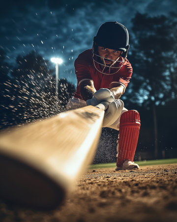 Focused male cricket player, batsman in red uniform making powerful shot, dirt flying off pitch under stadium floodlights.