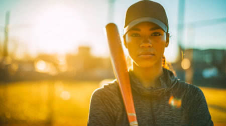 A determined female athlete grips her bat as golden sunset rays cast long shadows across the field, capturing a moment of focus and strength before the game.