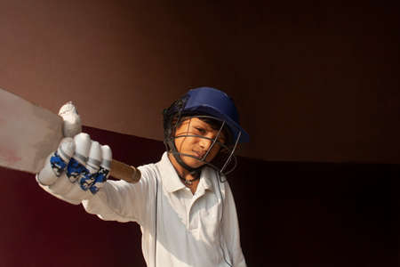 Portrait of boy wearing cricket Helmet and holding Bat