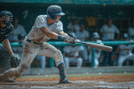 Baseball player swinging bat, making contact with a fast moving ball, creating a powerful impact with dust particles flying during an intense moment in a game
