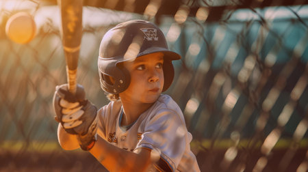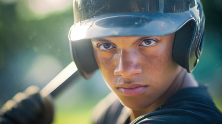 Portrait of a young athlete with short hair wearing a helmet, gripping a bat in a sunlit park. The background features soft-focus greens and yellows, capturing a dynamic sports moment.