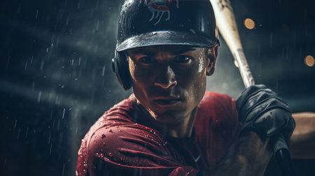 Young beautiful female baseball player in action with baseball bat during big match on rainy day.AI Generative.