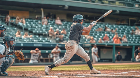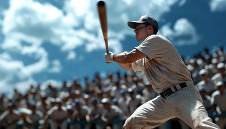 A professional athlete swings a bat to hit a home run during a baseball game in a packed stadium, symbolizing skill and victory.