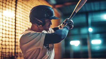 Close-up of a South Asian athlete wearing a black helmet, gripping a bat, with a baseball in motion. The scene is set on practice grounds with tall nets and soft lighting.