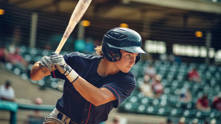 A focused baseball player in a stadium prepares to hit the ball with precision and intensity, capturing the essence of the game.