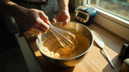 Hands whisking yellow batter in a metal bowl on a wooden surface near a window.