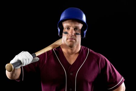 Portrait close up of a Caucasian male baseball player, a hitter, wearing a team uniform and a helmet, holding a baseball bat on his shoulder