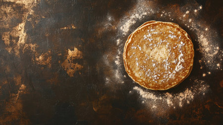 A beautiful top view of a golden pancake resting on a rustic wooden table, surrounded by a dusting of flour, perfect for breakfast or brunch.