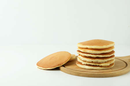 Pancakes on wooden plate and white background
