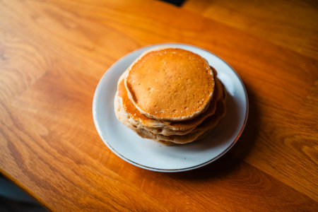 Fluffy pancakes with a golden brown texture served on a rustic wooden table for a cozy breakfast experience