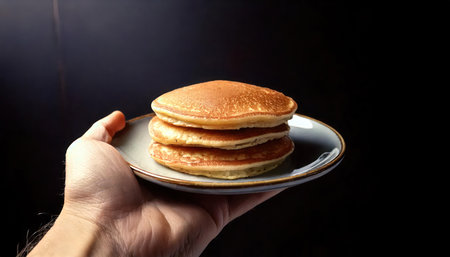 Pancakes in a plate in hand on a dark background.
