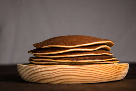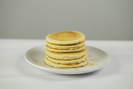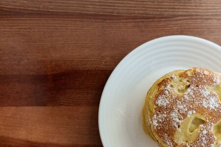 Close up fresh fluffy homemade pancakes on the plate. Ready to eat bakery for breakfast.
