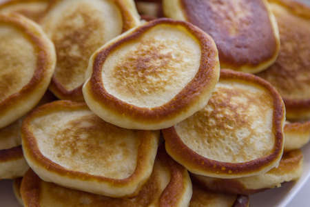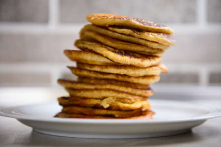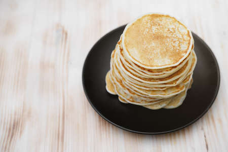 Close-up of a stack of freshly baked pancakes on a white ceramic plate. Shrove Tuesday concept
