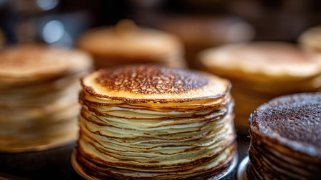 Golden crepes are neatly stacked, showing their warm, inviting texture, perfect for a delicious breakfast or dessert option.