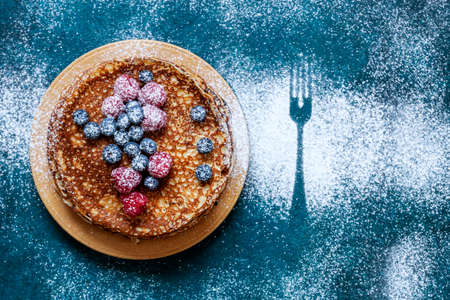 Delicious homemade pancakes with raspberries, blueberries and powdered sugar on classic blue background. Top view, close up