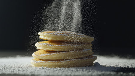 Elegant tower of five pancakes, sugar mist mid-motion, dramatic shadows, studio lighting, hyper-detailed realism, darkened background
