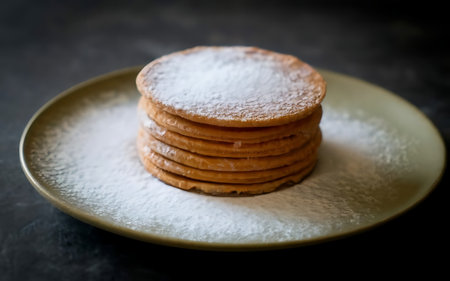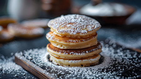Elegant 5-pancake tower, dramatic powdered sugar effect, realistic lighting, crisp reflections, side-on ray-traced scene, dark moody backdrop