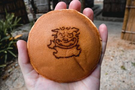 Japanese pancake snack with a symbol of mythical Okinawa dog Shisa