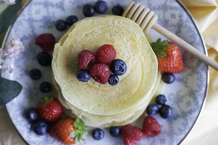 Blueberry Homemade pancake with sweet honey on wood table. horizontal photos