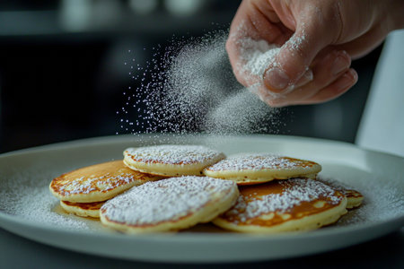 A chef is expertly dusting powdered sugar over a fluffy stack of pancakes on a white plate. The kitchen setting provides a warm ambiance, highlighting the delicious breakfast treat.