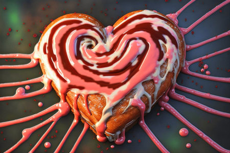 close-up of heart-shaped cinnamon roll, with drizzled icing and sprinkles, created with generative ai