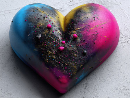 Heart-shaped object with a rich combination of black, pink, blue, and yellow pigments, featuring textured surface details and small, scattered speckles on its surface