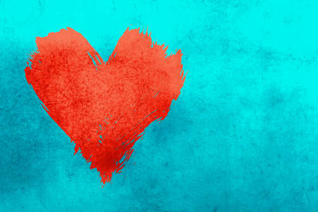 Red vivid watercolor painted heart with brushstroke grunge shape over winter frosty blue background