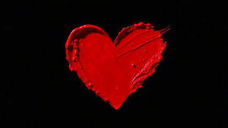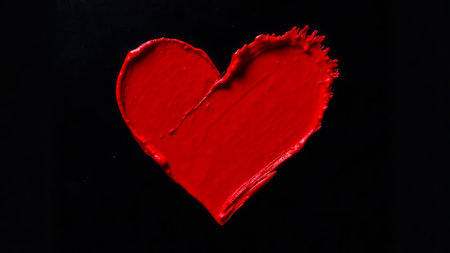 Artistic red heart painted with lipstick on black background. Red swatch. Bold and passionate design symbolizes love, romance and emotion. Perfect for Valentines Day, beauty and artistic concepts